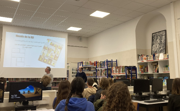 Ce mardi 17 décembre, les 3èmes C ont pu bénéficier de l’intervention au CDI de Laurent Parez de la librairie Dernier Rempart et d’Alexandre Moreigne, directeur de la médiathèque Albert